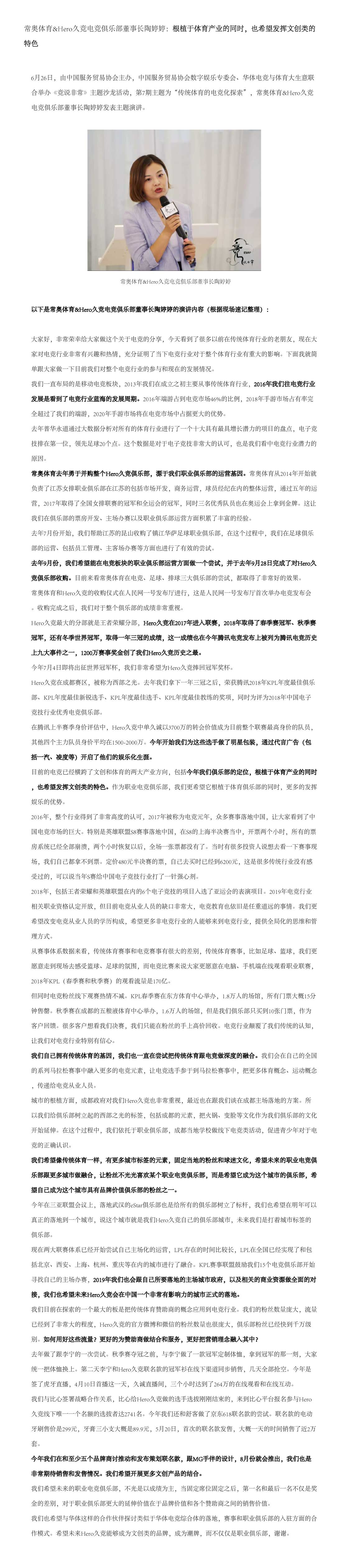 常奧體(tǐ)育&Hero久競電(diàn)競俱樂(yuè)部董事(shì)長(cháng)陶婷≠≥ε婷:根植于體(tǐ)育産業(yè)的(de)同時(shí),也‌β↔λ(yě)希望發揮文(wén)創類的(de)特色